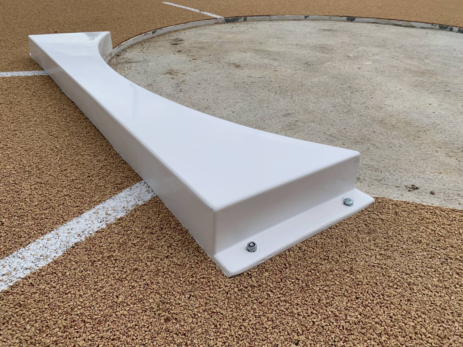 On retrouve ensuite notre référence UBSM120 BUTOIR LANCER DE POIDS, fabriqué en fibre de verre, de 10mm d’épaisseur, il présente une résistance élevée aux conditions météorologiques défavorables. Il dispose également de renforts intérieurs permettant son bon maintien dans le temps. Le système d’ancrage (compris dans la référence) comprend 4 points de fixations au sol. Le butoir dispose d’une peinture blanche spéciale extérieur